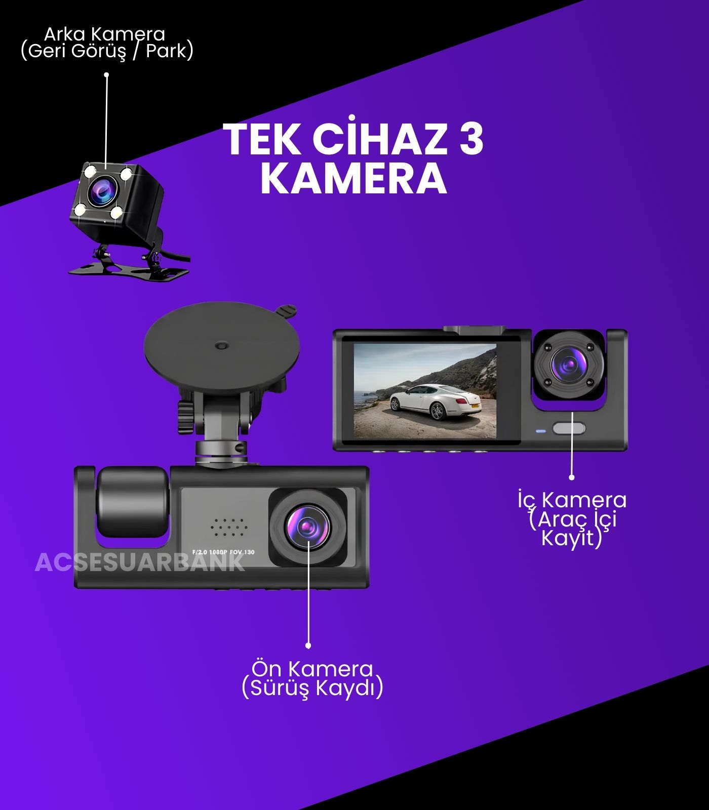 Bu model 3 kameralıdır. Ön, arka ve iç kamera aynı anda kayıt alır.