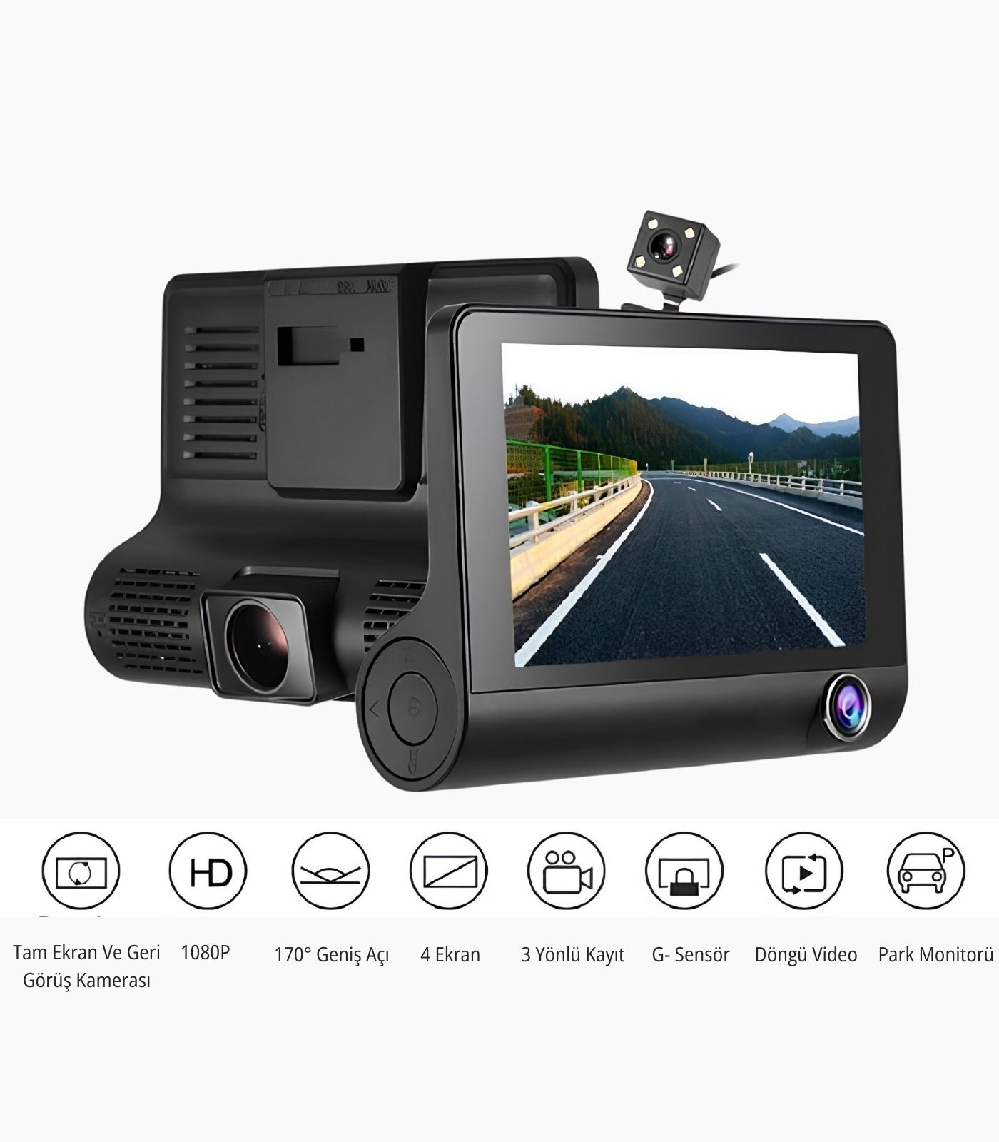 Bu gelişmiş Araç İçi Kamera, 3 adet kamerası ile ön, arka ve iç görüşü aynı anda kaydederek yolculuk sırasında tam kapsamlı güvenlik sağlar. 4 inç LCD ekran sayesinde kayıtları anlık olarak takip edebilir, menü üzerinden kolayca ayar yapabilirsiniz.