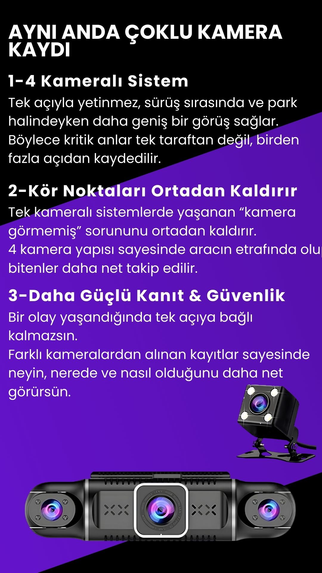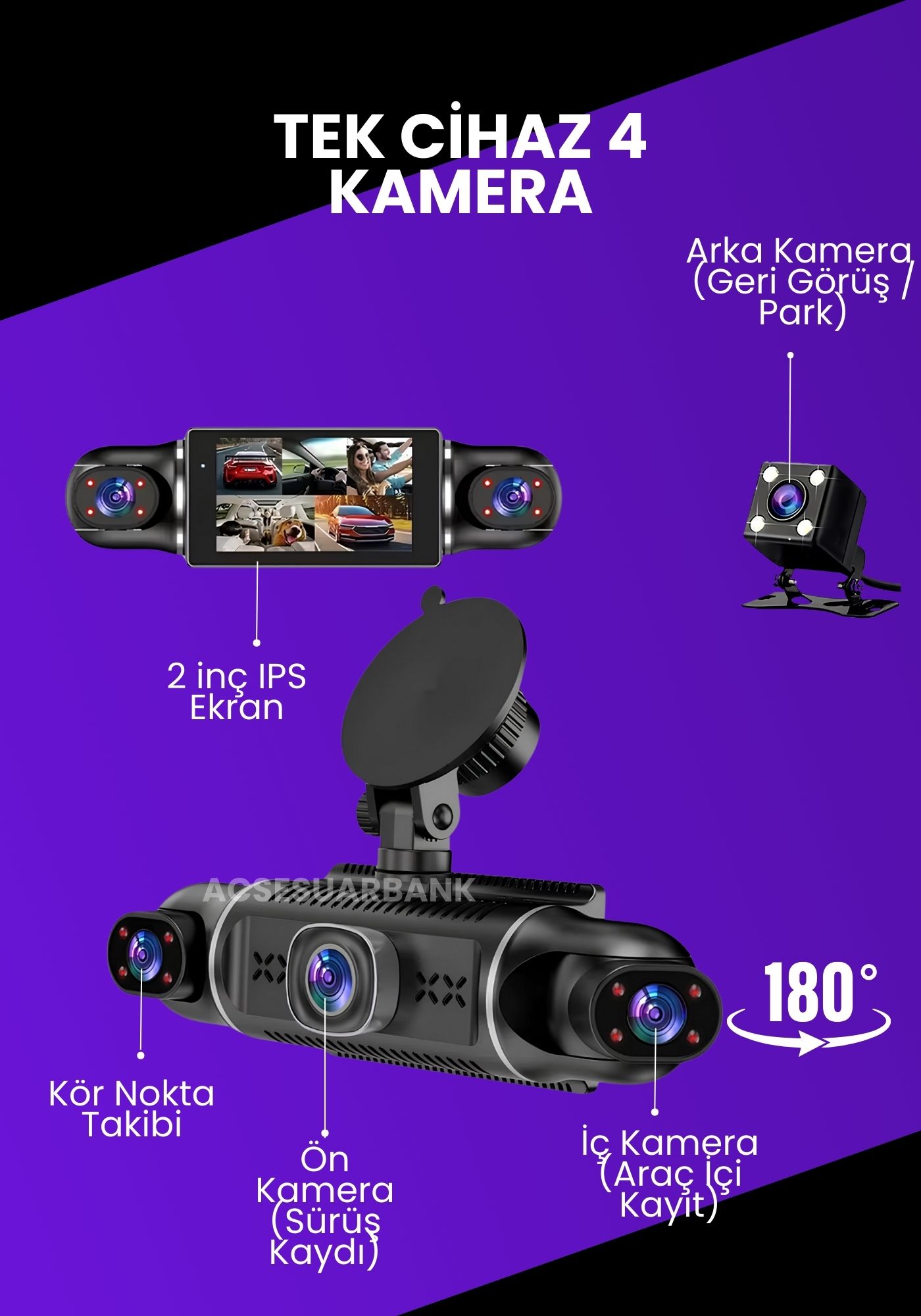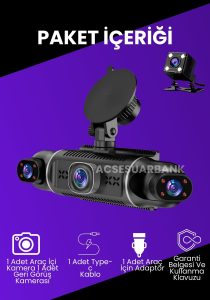 Bu model 4 kameralıdır. Ön, arka, sağ ve sol kameralar aynı anda kayıt alır. Acsesuarbank’ta satılan bu sistem kör noktaları ortadan kaldırır.
