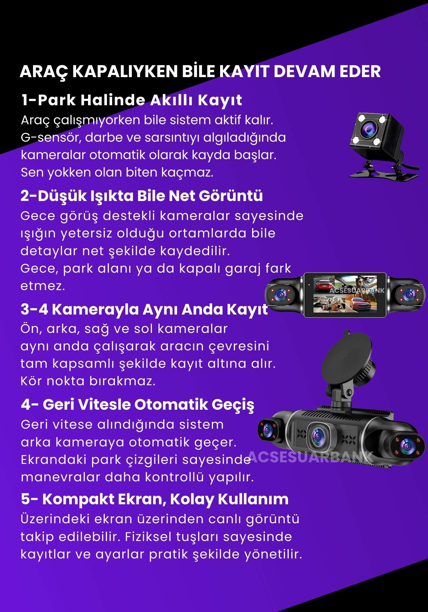 Evet. Gece görüş destekli kameralar sayesinde düşük ışıkta bile net görüntü alınır. Acsesuarbank sürüş güvenliği için bu özelliği özellikle sunar.