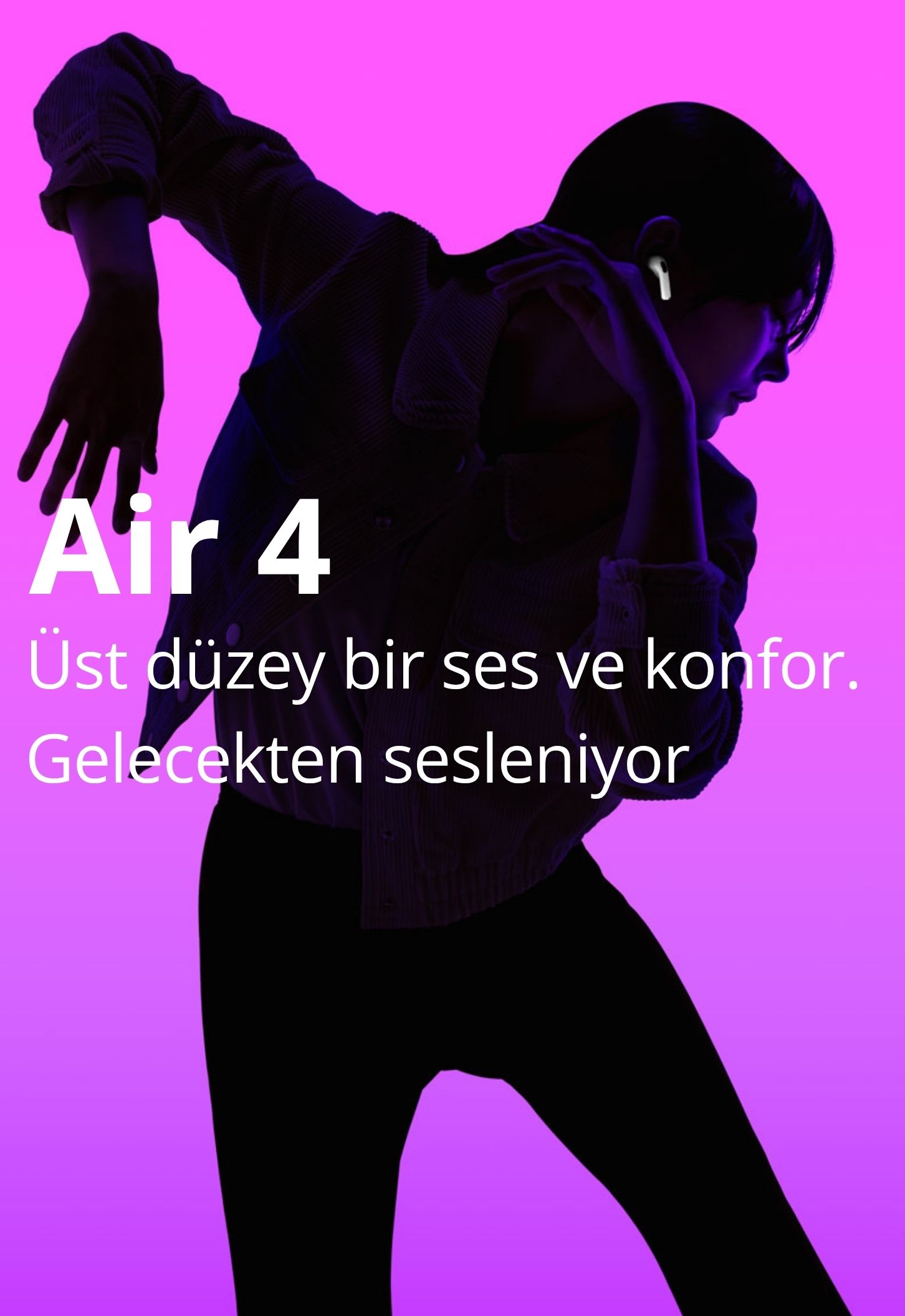 Air 4, aramalarda ve müzikte ses kalitesini bir üst seviyeye taşıyor. Akıllı özellikleri sayesinde her dinleme ortamına otomatik olarak uyum sağlar. Tam sessizlik istediğinizde gürültüyü yok eder, dış sesleri duymak istediğinizde şeffaf moda geçer.