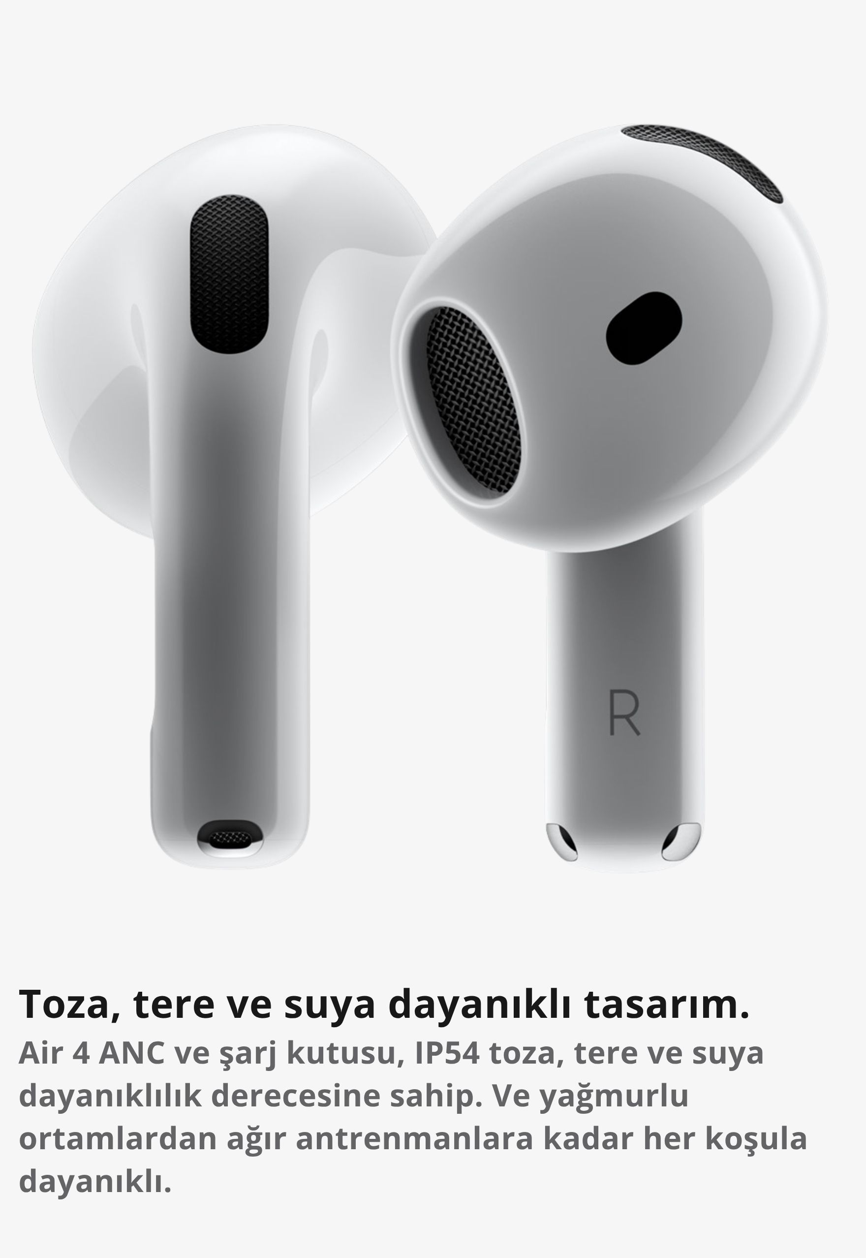 Air 4 ANC, IP54 toz, ter ve suya dayanıklılık derecesine sahiptir. USB-C şarj girişiyle kolayca şarj olur ve kutusuyla birlikte 30 saate kadar dinleme süresi sunar. Ayrıca Bul özelliği destekli hoparlörlü şarj kutusu, kulaklığınızı kaybettiğinizde kolayca bulmanızı sağlar.