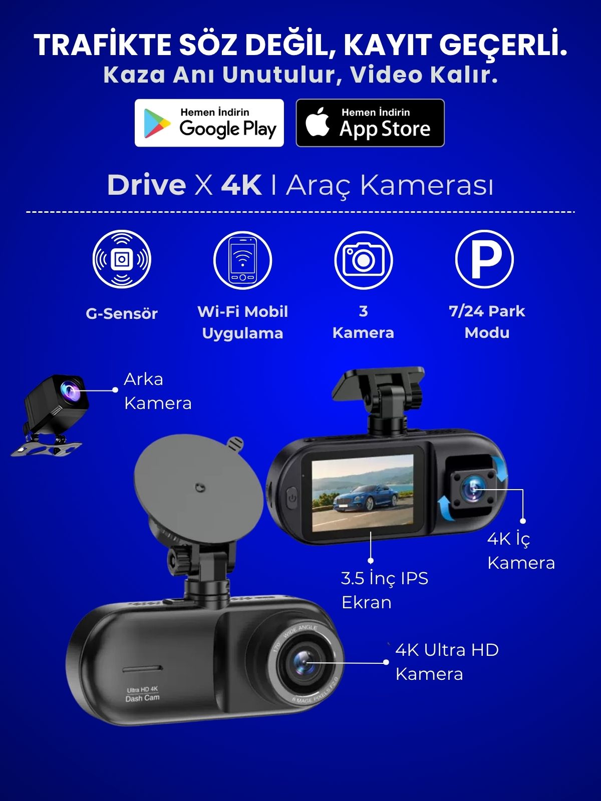 4K Araç İçi Kamera Drive X (Ön + Arka + İç, GPS, Tam Koruma)