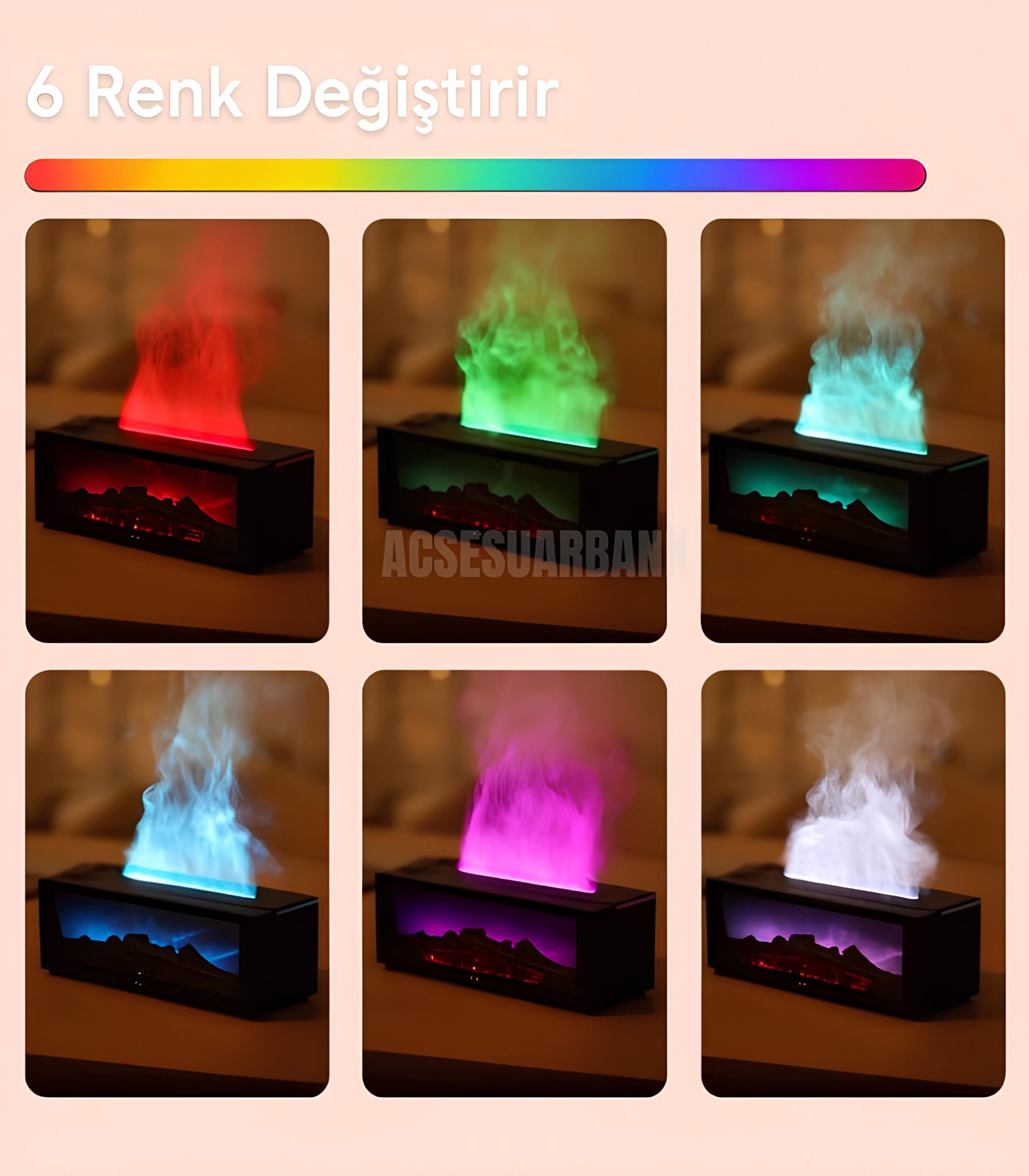 Şömine efekti ve 6 farklı aydınlatma rengi ile bu difüzör, ortamı ruh haline göre şekillendirir. Sıcak tonlarla huzurlu ve samimi bir ambiyans yakala; mavi tonlarla dinginliği hisset ya da ferahlatıcı yeşillerle alanını canlandır. Dekorasyonuna benzersiz bir sıcaklık ve rahatlama dokunuşu kat.